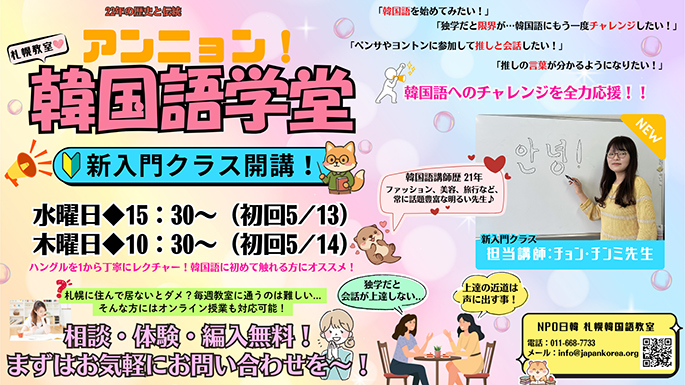 「アンニョン!韓国語学堂」札幌教室は、おかげさまで今年で22年目!