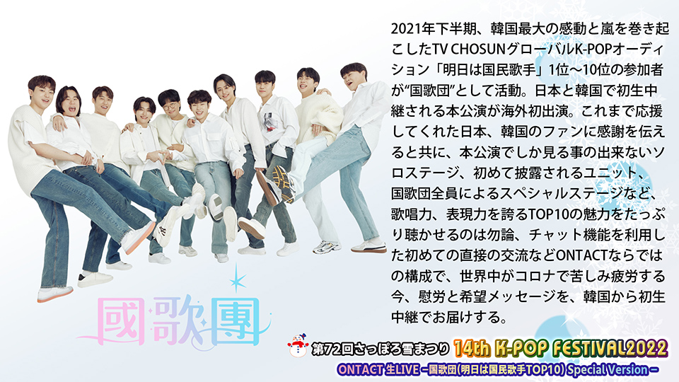 2022年2月23日(祝・金)、「第72回さっぽろ雪まつり14th K-POP FESTIVAL2022 ONTACT 生LIVE -国歌団(明日は国民歌手TOP10) Special Version -」を、韓国から初生中継で開催。