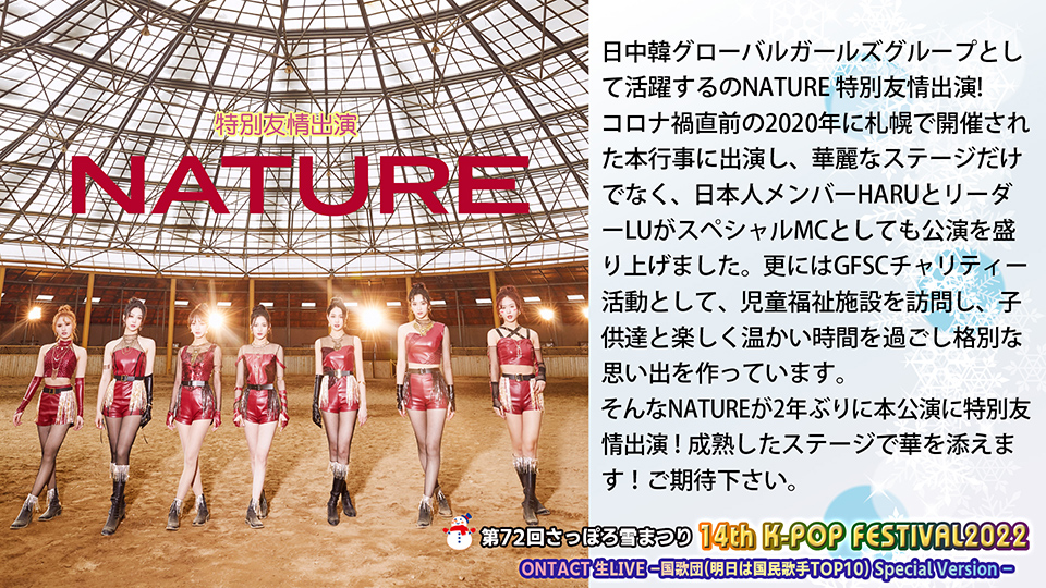 コロナ禍直前の2020年に札幌で開催された本行事に出演し、華麗なステージだけでなく、日本人メンバーHARUとリーダーLUがスペシャルMCとしても公演を盛り上げました。更にはGFSCチャリティー活動として、児童福祉施設を訪問し、子供達と楽しく温かい時間を過ごすなど本公演は格別な思い出で繋がっております。そんなNATUREが2年ぶりに本公演に特別友情出演し、更に成熟したステージで華を添えます。
